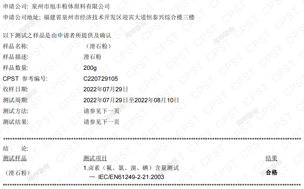 我司已連續(xù)多年將自身滑石粉送至第三方檢測(cè)機(jī)構(gòu)進(jìn)行鹵素含量測(cè)定,產(chǎn)品各項(xiàng)指標(biāo)均可滿足標(biāo)準(zhǔn)要求,客戶可放心使用,具體檢測(cè)結(jié)果見(jiàn)下表。