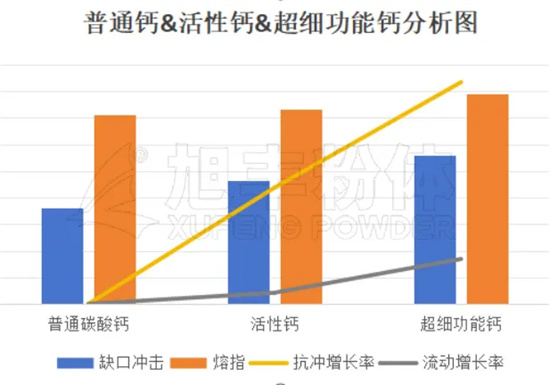 以下為經(jīng)過改性后超細功能碳酸鈣與普通碳酸鈣和活性鈣的力學性能差異性,超細功能碳酸鈣在抗沖性能與流動性方面相比普通碳酸鈣有明顯優(yōu)勢。在滿足性能的前提下,可減少配方體系中POE添加量,降低配方綜合成本。