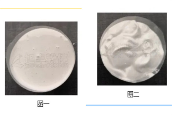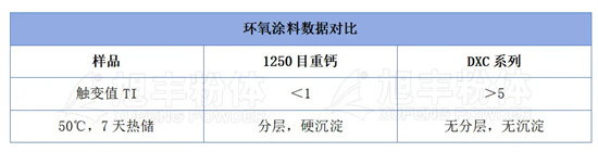 由于(攪拌或搖動)其粘度即降低的流動性質(zhì),稱為觸變性。可以通過粉體表面改性提高涂料體系的觸變值。由于有觸變特性,當涂刷較厚時不會出現(xiàn)流掛現(xiàn)象,同時有儲存穩(wěn)定性好等優(yōu)點。(以下為改性前后的數(shù)據(jù)對比,圖一為1250目重鈣,圖二為DXC系列改性粉體)