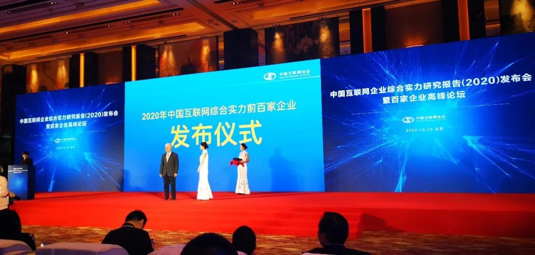 2020年10月29日,由中國互聯網協會舉辦的中國互聯網企業綜合實力研究報告(2020)發布會暨百家企業高峰論壇在北京隆重召開。